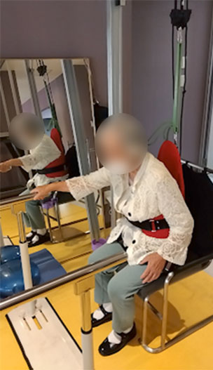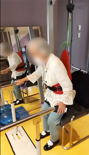 今回の方は吊り位置のほぼ真下に座っていただいていますが、起立動作の第一相~第二相である体幹屈曲から離殿動作が困難な方は、椅子をやや後方に置いて前上方からのゴムの牽引により体幹屈曲と離殿動作を補助して訓練を行います。
