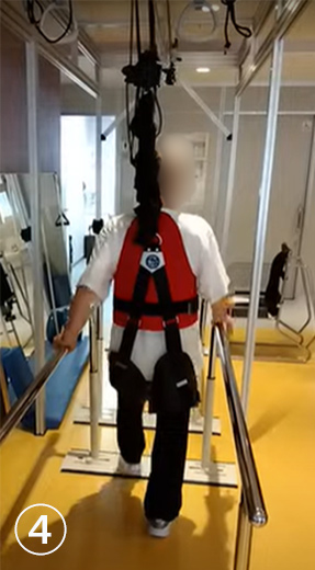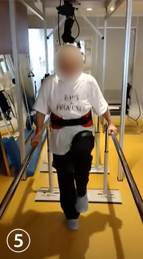 ③スペースワンダーを装着し、平行棒を併用して、歩隔を狭めて歩行訓練を反復します。肩や骨盤のバランスも保たれています。平地では安定して歩けています