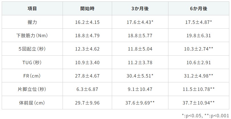 スペースワンダートレーニング開始時、3か月後および6か月後の各指標の測定結果