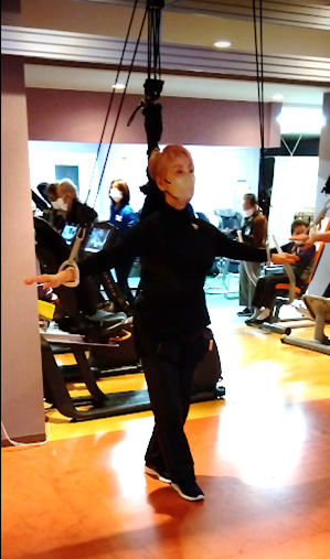 スペースワンダーのトレーニングには左の写真(綱渡りのポーズ)のような種々のバランストレーニングがありますが今回は個別機能訓練で実施しているより高難度のトレーニングを紹介いたします。
