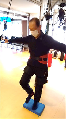スペースワンダーを装着して写真のような不安定なマットの上で様々なトレーニングを行います。
