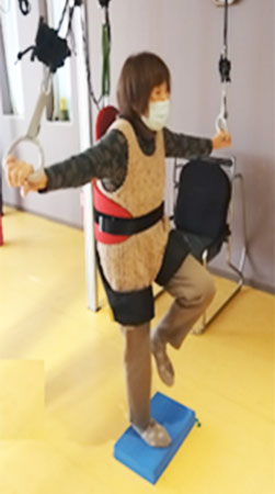 スペースワンダーのトレーニングには左の写真(綱渡りのポーズ)のような種々のバランストレーニングがありますが今回は個別機能訓練で実施しているより高難度のトレーニングを紹介いたします。