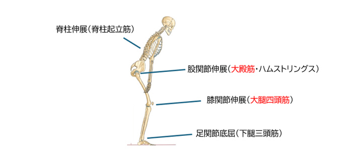 椅子から立ち上がる際には、大腿四頭筋や大殿筋だけではなく、上の図で挙げてる以外にも主働筋の周囲や遠く離れた筋肉が協調して動作を行っています。