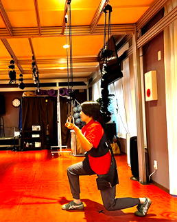 ランジは足を前後に大きく開く分、前後のバランスは安定するが側方へのバランスを維持する必要があります。本来、強度の高い運動ですがスペースワンダーを装着して安全に反復することが可能です。
